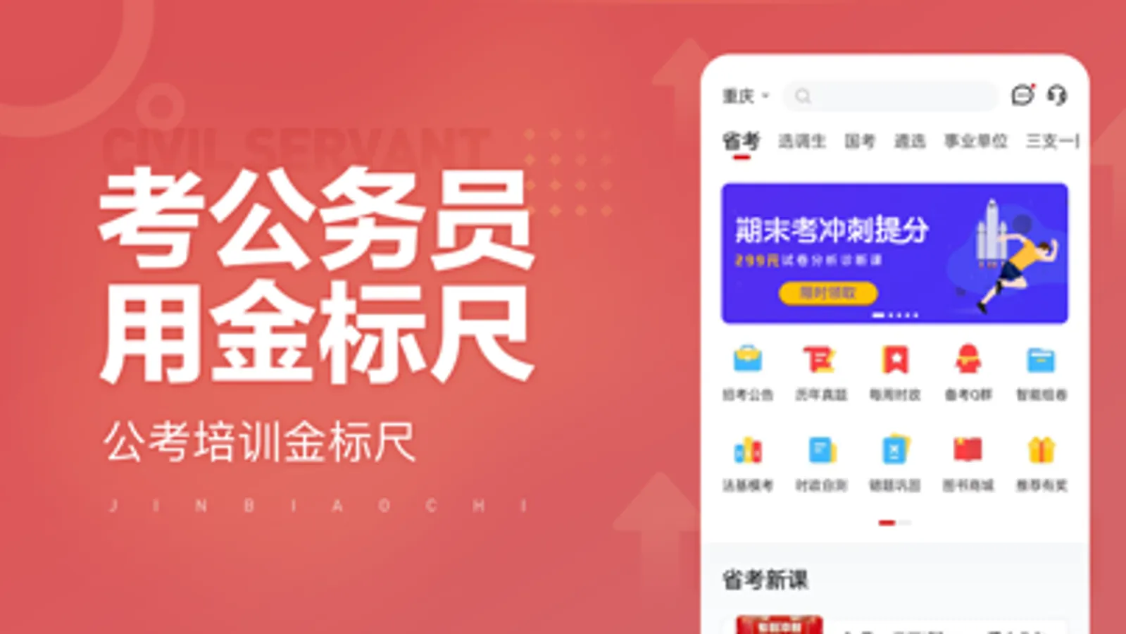 “金标尺公考”是专为公务员考试设计的备考学习平台,集专项题库、历年真题、系列图书、精品课程为一体,致力于向用户提供优质、高效、个性化的在线教育服务。