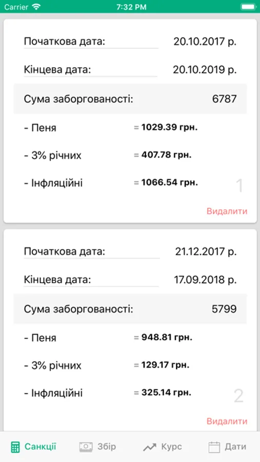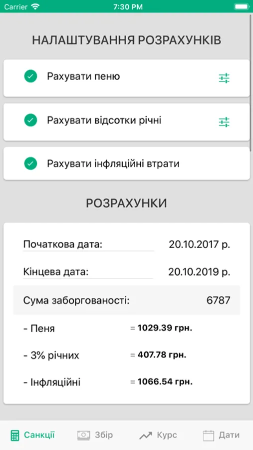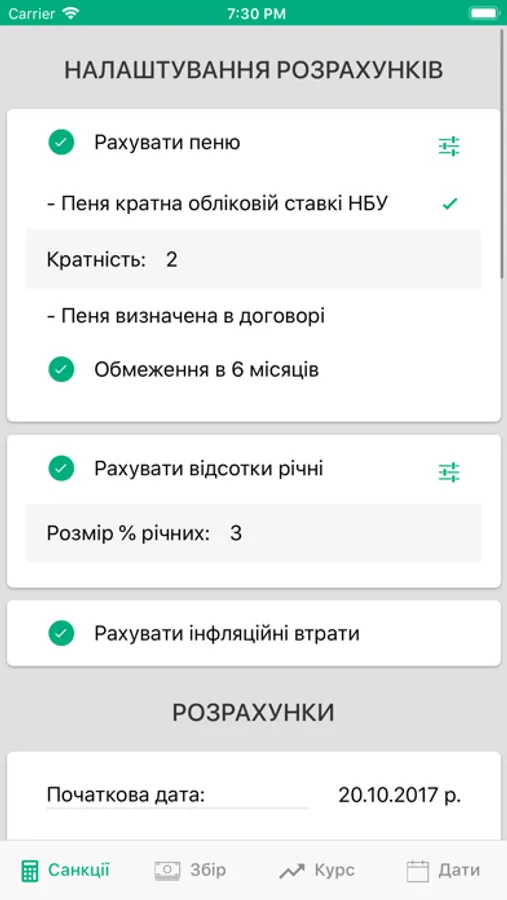 - калькулятор пені, відсотків річних, інфляційних втрат