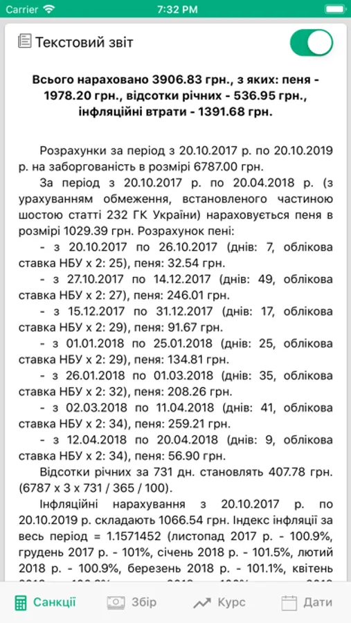 Калькулятор здійснює розрахунки на заборгованість за необхідні періоди та надає детальний текстовий звіт здійснених нарахувань. Крім того, розрахунок пені може бути здійснено з урахуванням максимального періоду нарахування в 6 місяців та з обмеженням подвійною обліковою ставкою НБУ (коли розмір пені встановлено в договорі).