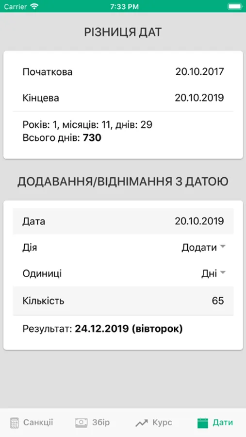 - різницю дат або збільшення/зменшення дати