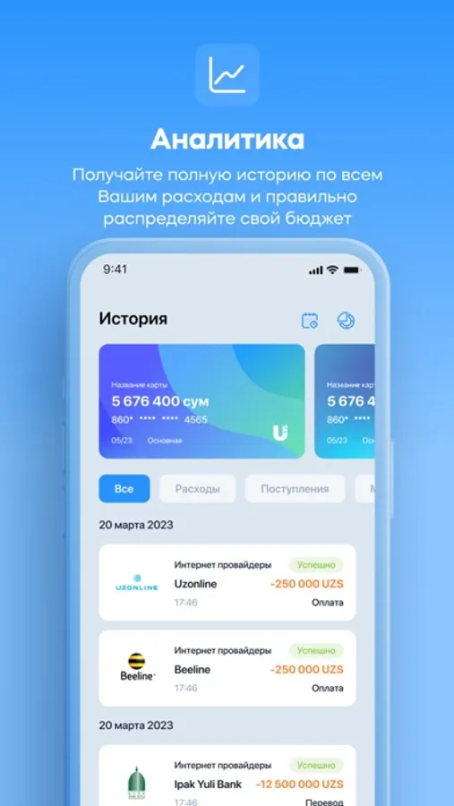 - История платежей. Получайте историю по всем вашим расходам и пополнениям, и полностью контролируйте свои финансы.