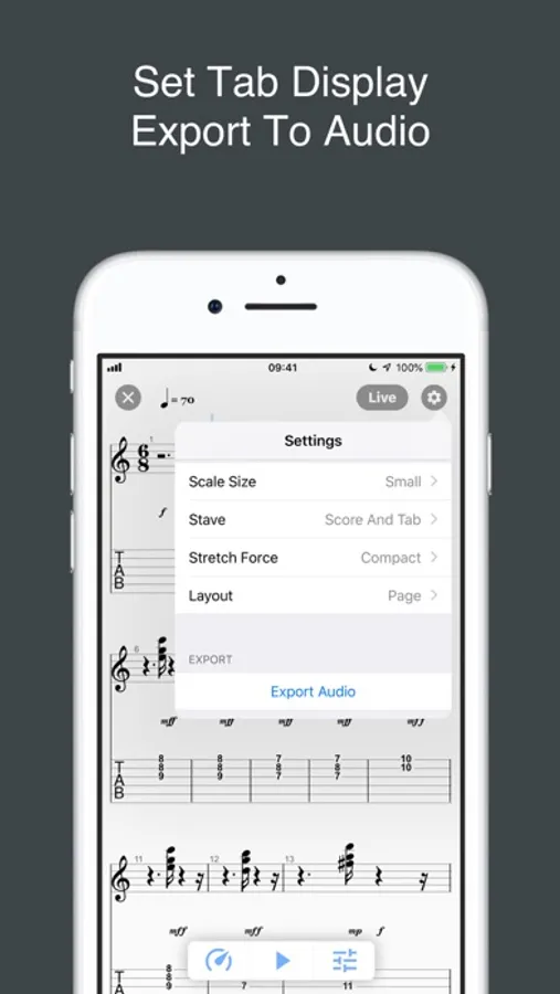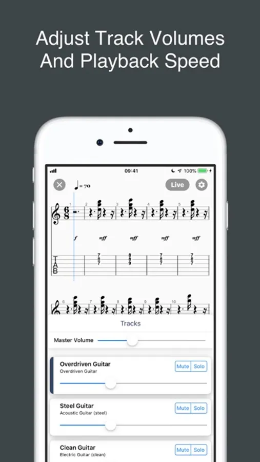 - Playback of guitar tabs, support mute/solo and volume adjustment of any track