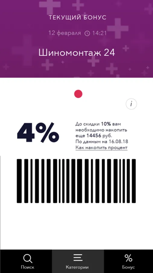 Приложение позволяет накапливать процент скидки и использовать его при оплате услуг в организациях, где действует "Процент+"