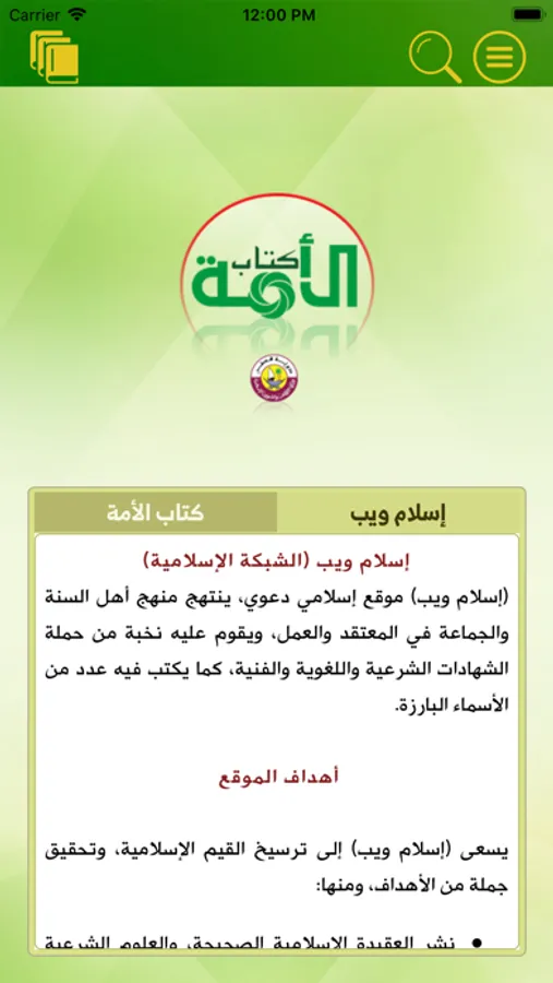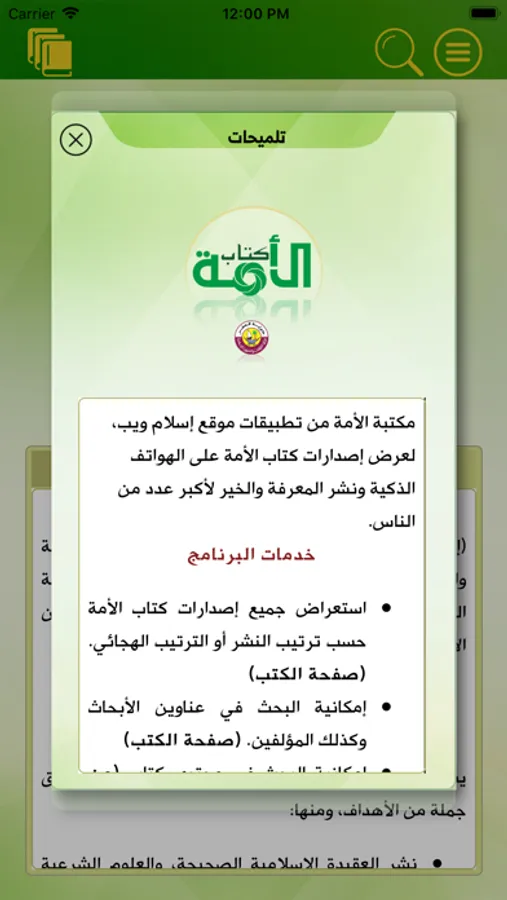 - يمكنكم هذا البرنامج من استعراض جميع إصدارات كتاب الأمة، بحيث يتم عرض كل بحث في صفحة كاملة.