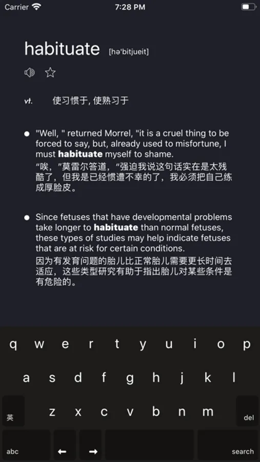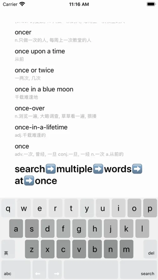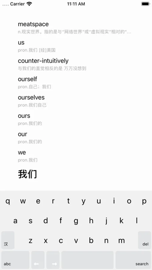3. 打造词典查询专用键盘:手指在键盘区域即可完成查词、再查词、历史记录浏览等功能,再也没有烦人的返回上一步,连续查词从未如此酣畅淋漓!