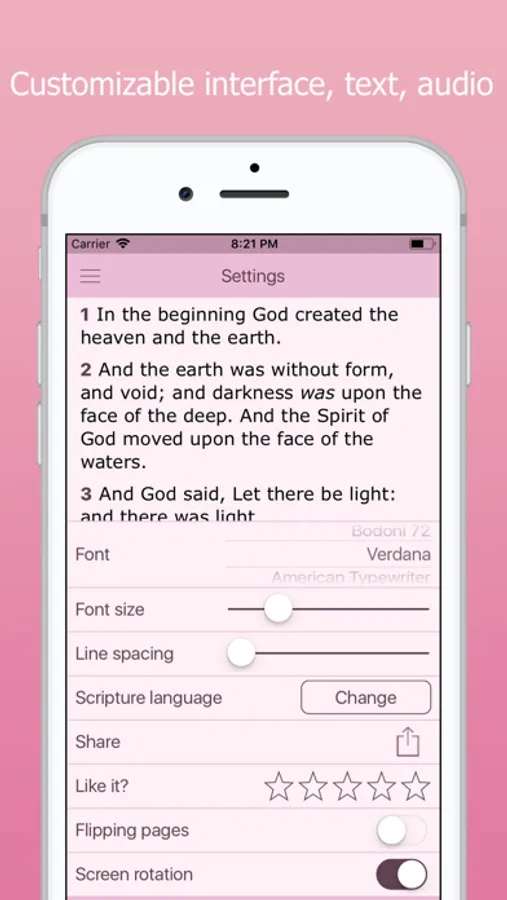 Fast search, simultaneous works with multiple verses, text and audio customization, flipping pages option -- all works offline