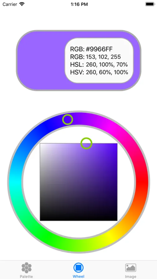 This color picker shows you the RGB, HSV and HSL values of a color that you select by: