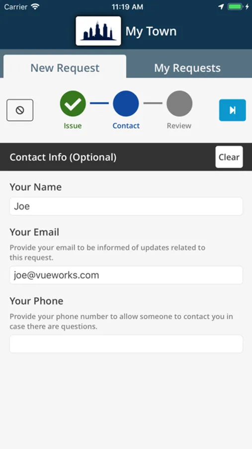 CitizenVUE is a mobile application used to encourage community involvement by engaging residents to submit a service request to the local service organization in order to help maintain safety and awareness. Citizens who live in participating areas can download the free application. When an item of concern is seen, citizens may submit a request and include comments, photos and documents to provide additional details on the issue. Email tracking of the request is optional. Service Requests received through CitizenVUE will populate directly into the organization’s VUEWorks asset management software.