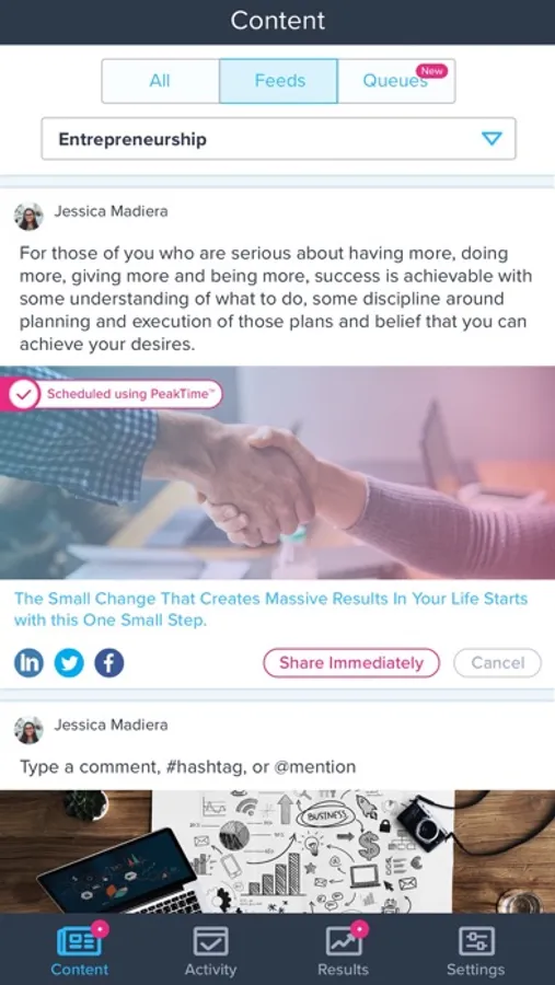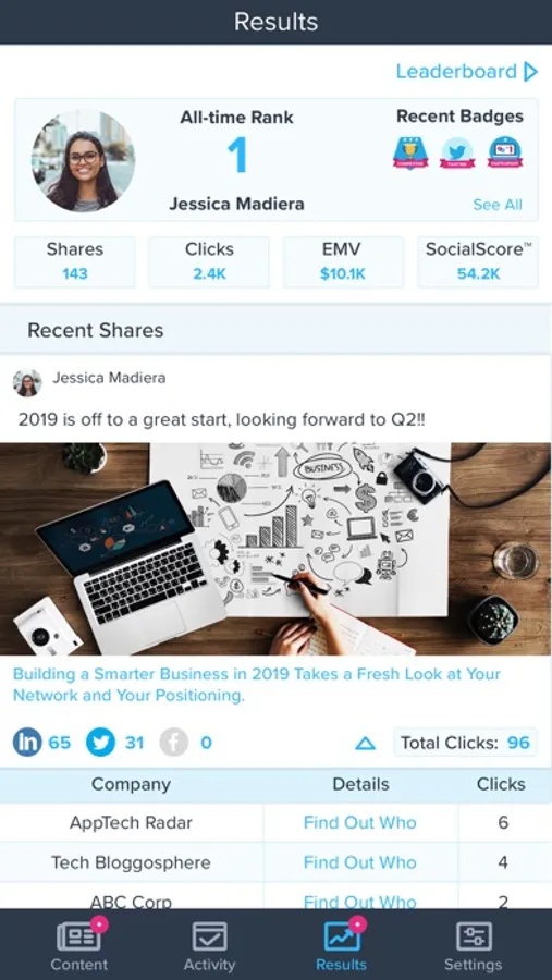 Once your content is scheduled, you can track its activity on your connected social networks. See how you stack up against the competition using our leaderboard, and view your overall progress on our results screen. As you continue to share great content, earn badges for your success.