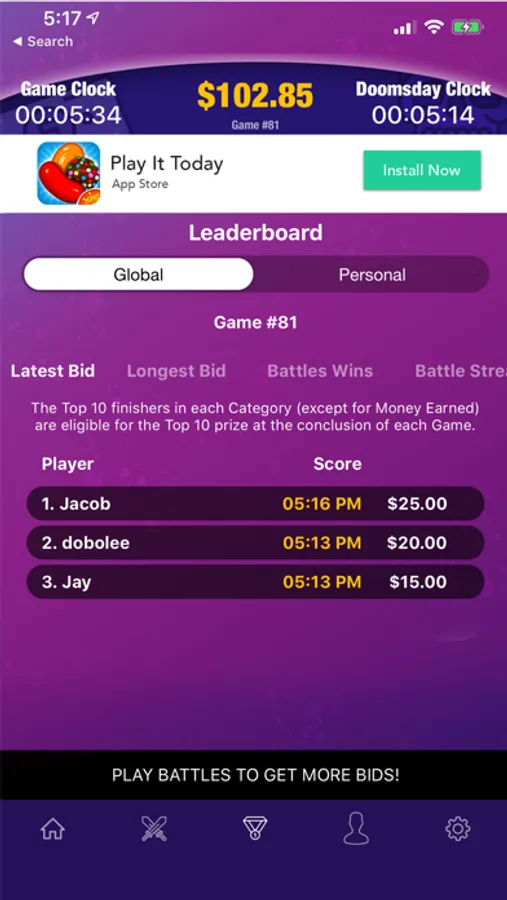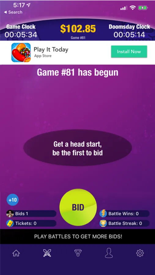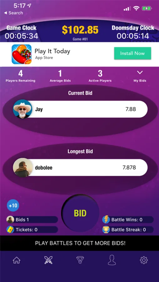 Each Bid is timed to determine the Longest Bidder by measuring how long a Player holds the Current Bid position before the next Bid overtakes it. But each Bid also adds more time to the Game Clock, though it will never exceed its original starting time. Hold the Current Bid or Longest Bid when the Game Clock hits Zero and you Win.