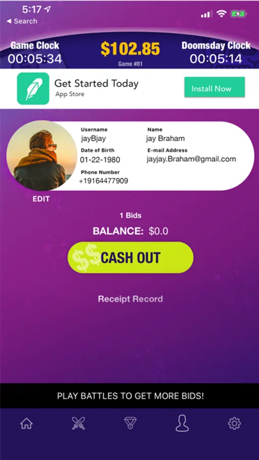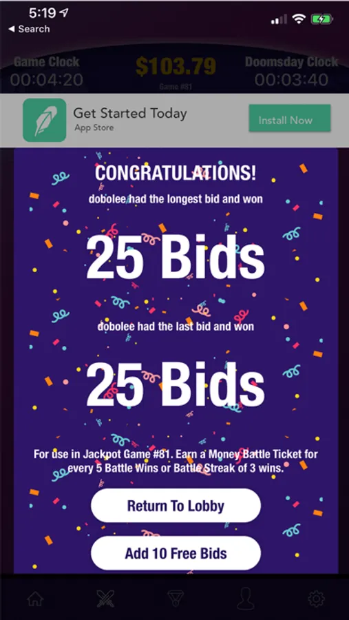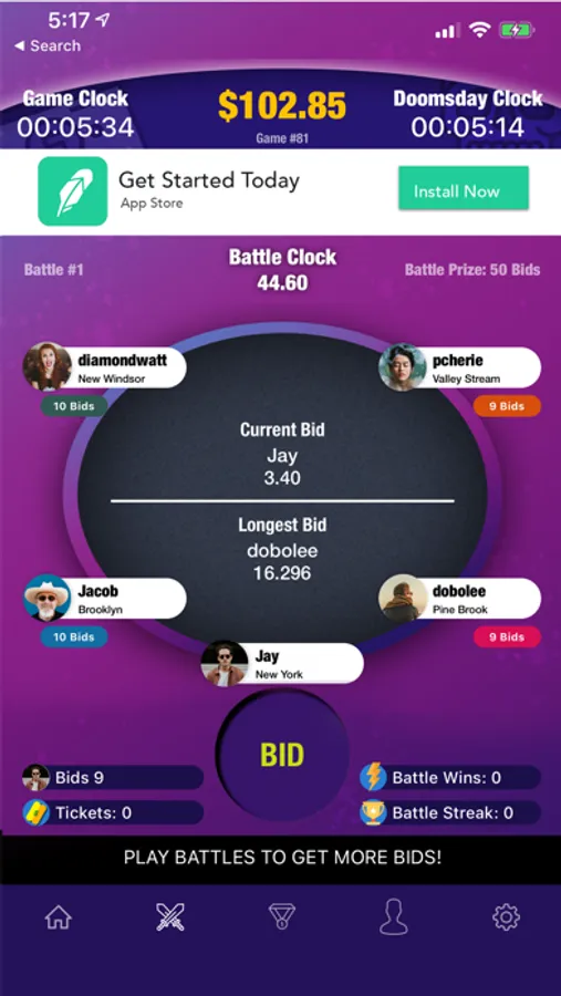 Tick Tock is an exciting game of skill, strategy, and endurance, played for real Cash Prizes. Through the use of free Bids, the objective of the Game is to gain position as the Last Bidder or Longest Bidder in the Game, all while a Game Clock counts down to zero.