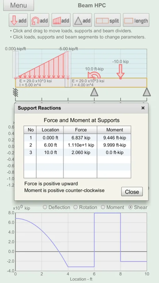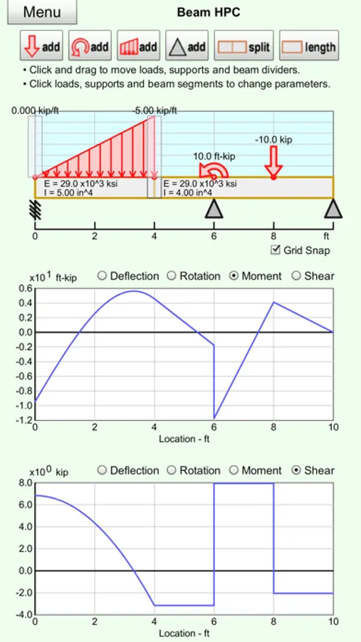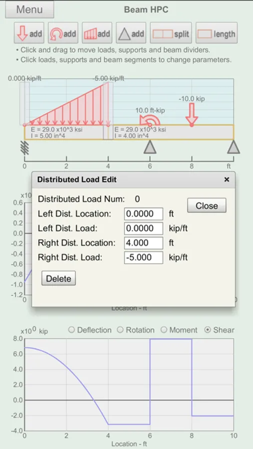 Beam HPC app calculates the moment, shear, deflection and rotation diagrams for a beam with various types of loading. Loading types include forces, moments and distributed loads. The load location and magnitude can be changed at any time. There are three types of supports (i.e. boundary conditions) including pinned, fixed and vertical roller. Each beam can be split into sub-beam segments. Each beam segment can have a different moment of inertia (I) and stiffness (E). The user can click and drag all items to quickly change and compare results. This program is designed for educational uses only. It should not be used for commercial purposes. There is no warranty or guarantee the results are accurate, and the user accepts all responsibility for values calculated.