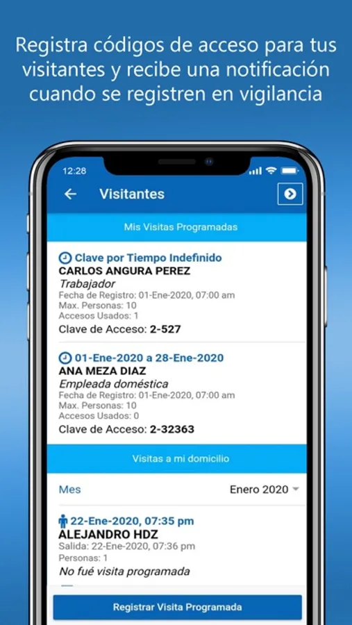 • REGISTRAR VISITAS PROGRAMADAS! El residente puede generar mediante la app claves de acceso para sus visitantes, mismas que se deben proporcionar en caseta de vigilancia para que se les permita la entrada al fraccionamiento o condominio.