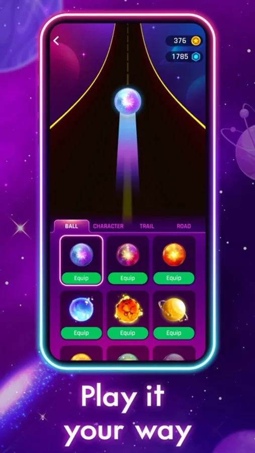 Guide the ball to match other balls of the same color while listening carefully to the music. Collect the coins and Gift Boxes to unlock new treasures. Train your eyes coordination when the ball suddenly change color on the dancing road.