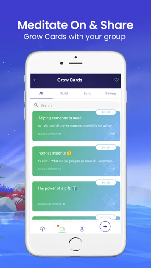 ● Search option enables you to search for hashtags, shares, grow cards, groups, friends, prayers: already prayed and not prayed.
