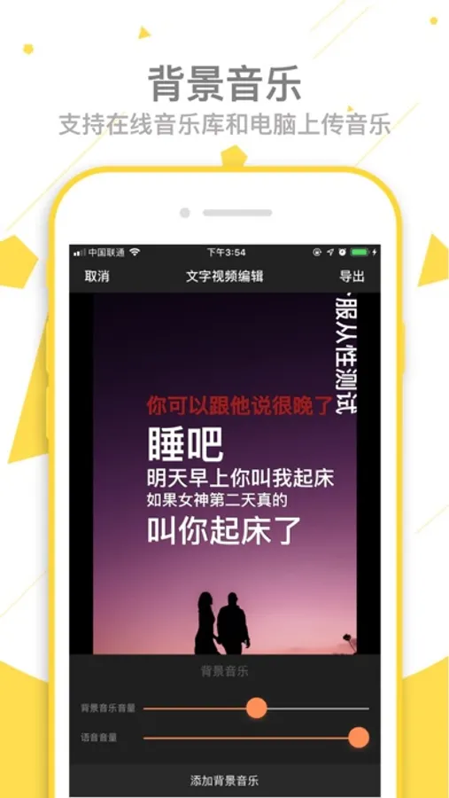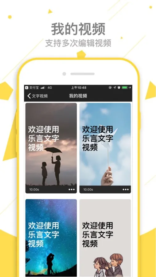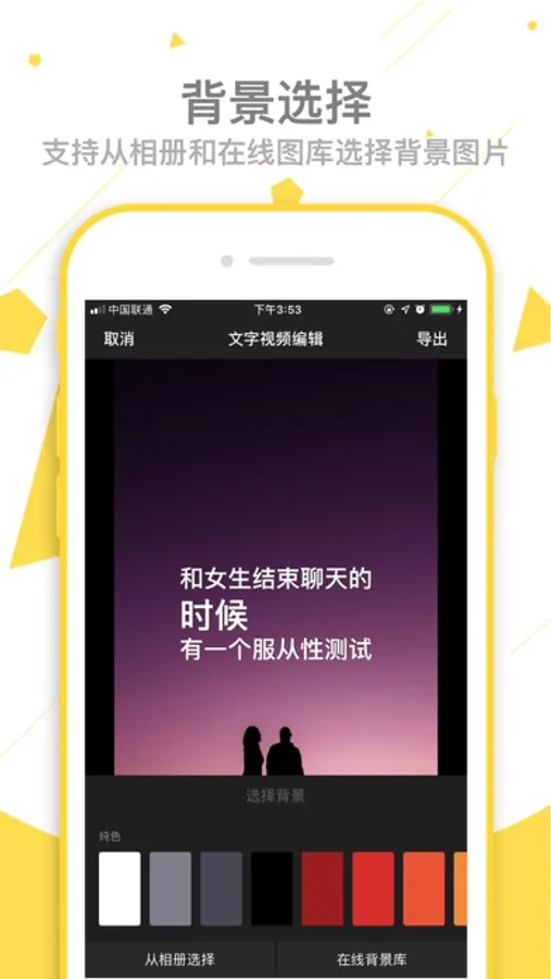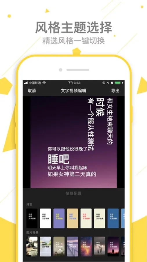 方便快速制作最火的文字动画视频,支持背景音乐、背景图片、文字颜色、文字描边、文字字体、支持快捷配置,让您无需任何特效剪辑技术也可以制作文字动画视频。