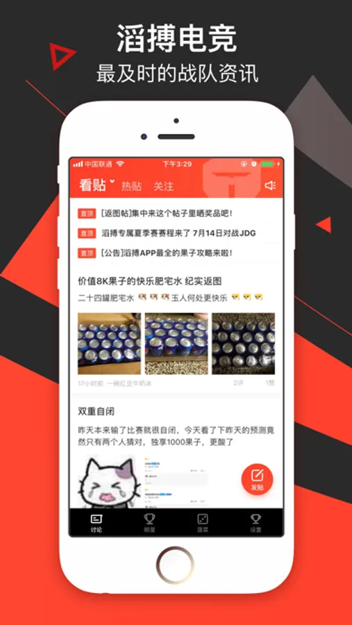 这里是滔搏电子竞技俱乐部官方社交APP,是滔搏粉丝们的乐园。在这里你可以第一时间了解到滔搏战队的比赛动态和队员资讯,选手们会不定时冒泡参与APP的活动与粉丝互动。每逢节假日和选手生日,APP都会举办福利活动抽送精美礼品与战队周边。想GET队员同款?战队签名?APP兑换商城每周一都会进行上新放送,还会有超值秒杀活动哦!与此同时APP还提供全面丰富的电竞咨询,精准迅速的赛事数据服务,当你不能赶上比赛直播时还有贴心的文字赛事直播!当然还可以参与赛前活动预测比赛走向,丰富的果子奖励等你来拿!想和志同道合的小伙伴一起讨论喜欢的战队和选手?滔搏电子竞技俱乐部APP大家庭欢迎你的加入!