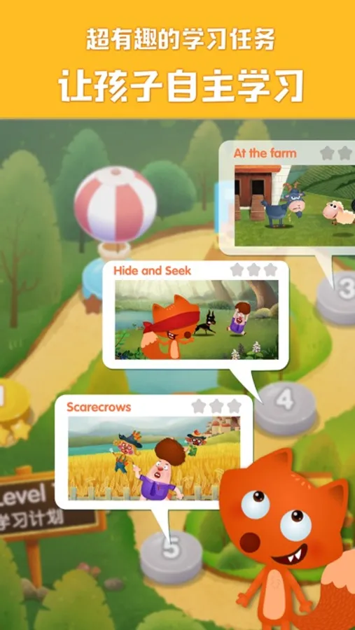 RunFox剑桥儿童英语是RunFox 系列之一,适合2-7岁儿童学习少儿英语,儿童英语,宝宝英语,幼儿英语,英语启蒙,小学英语的英语学习。在这里,孩子将按照剑桥儿童英语教学体系学习,通过丰富的情景式互动对话、智能语音评测系统、单词学习系统,让孩子从不会说英语到能自如使用英语进行交流。