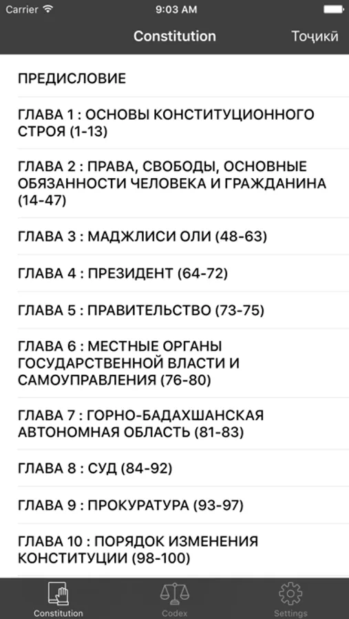 Данное приложение представляет собой бесплатный простой справочник по всем кодексам Республики Таджикистан.