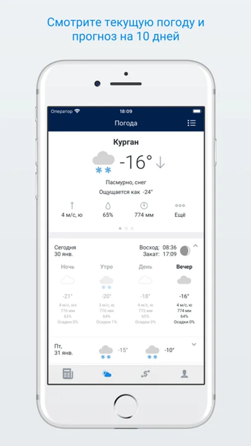 - смотреть текущую погоду и прогноз на ближайшие 10 дней;