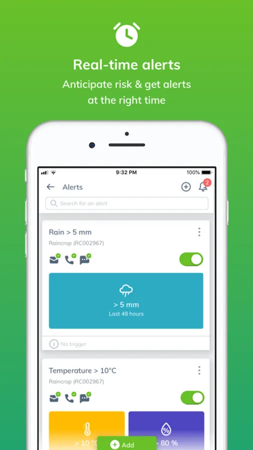 • Alerts: frost, treatment, leaching, etc. Activate an SMS, email or phone call alert and be warned as soon as the conditions are reached, to act at the best time