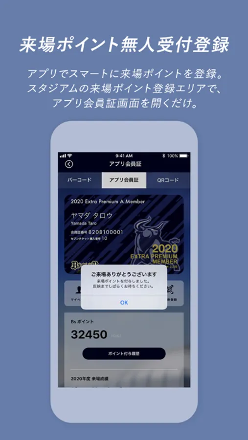 スタジアムの来場ポイント登録エリアで、アプリ会員証画面を開くだけ。