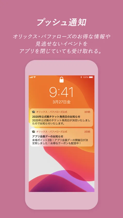 オリックス・バファローズのお得な情報や見逃せないイベントをアプリを閉じていても受け取れる。