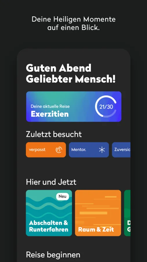 Die ›Exerzitien‹ haben ihren Ursprung in der »Kloster-Community«. Heute wie gestern helfen sie dir, deine Spiritualität zu vertiefen. Du wirst erinnert, dich neu auszurichten: auf deine Mitte, auf das Wesentliche, auf Gott. Was ist deine Sehnsucht in diesem Moment? Welche Möglichkeiten zum Handeln siehst du? Wo nimmst du Gottes Gegenwart wahr? Wähle spontan zwischen Audio- oder Textversion und verschieden langen Zeitfenstern.