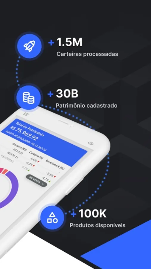 Baixe e acompanhe seus investimentos em Tesouro Direto, Fundos Imobiliários, LCI e mais. Fique por dentro do seu lucro e acesse benchmarks financeiros (CDI, Ibovespa e IPCA).