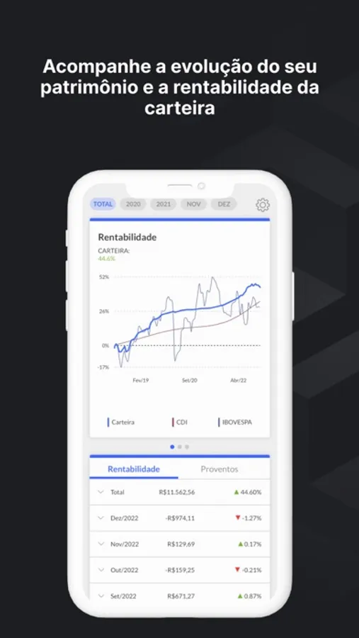 Oferecemos relatórios de rentabilidade, uma lista com os eventos da sua carteira (dividendos, juros, desdobramentos), além de benchmarks (CDI, Ibovespa e IPCA). Dê adeus às planilhas de investimento!