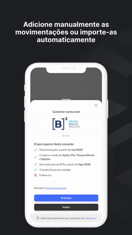 - Cadastro de ativos intuitivo para lançamentos manuais na sua carteira