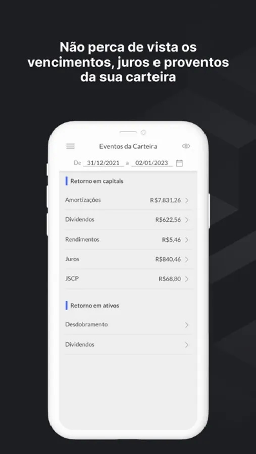 - Todos os Eventos Corporativos da carteira filtrados por período: Dividendos, Juros, Grupamentos/Desdobramentos, Rendimentos