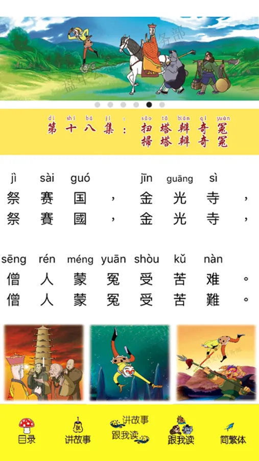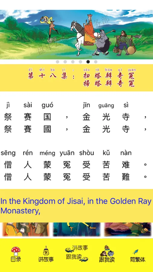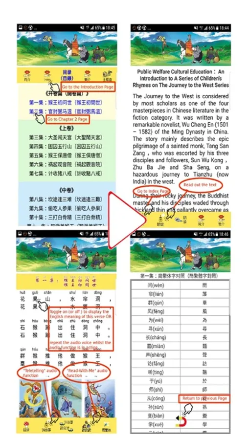 Each episode has a “Taletelling” menu and a “Read-With-Me” menu; both are equipped with sound tracks. The “Taletelling” part takes the children and the readers to the story itself, and lets them immerse themselves in the fantastic journey that Tang, Sun, Zhu and Sha were going through. In the “Read-With-Me” part, kids or readers will read aloud with the pre-recorded voice, learning to speak out the sounds of Mandarin and further enjoying the pleasure of learning the Chinese language.