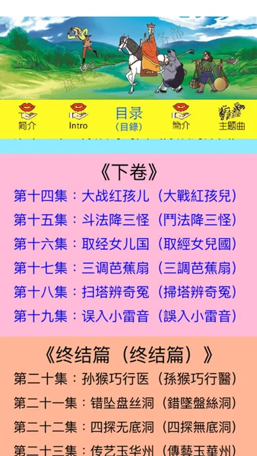 A collection of mobile applications, The Journey to the West Series, is produced to allow users to view the stories in caricature and to learn Mandarin in children’s rhymes. The purpose of our creation is to pique the young minds’ interest in the classic stories, their realization, appreciation and love of Chinese culture. An even more ambitious motive is to give children all over the world an opportunity to get in touch with Chinese culture and to enjoy some wondrous fantasies while they may start learning Mandarin. The whole collection has five volumes (5 sets), totaling twenty-five episodes. The “Introduction Volume” is the first set which can be down-loaded free of charge. Then follow the “First Set”, “Second Set”, “Third Set” and the “Grand Finale” (all of which are fee-charging downloads) .