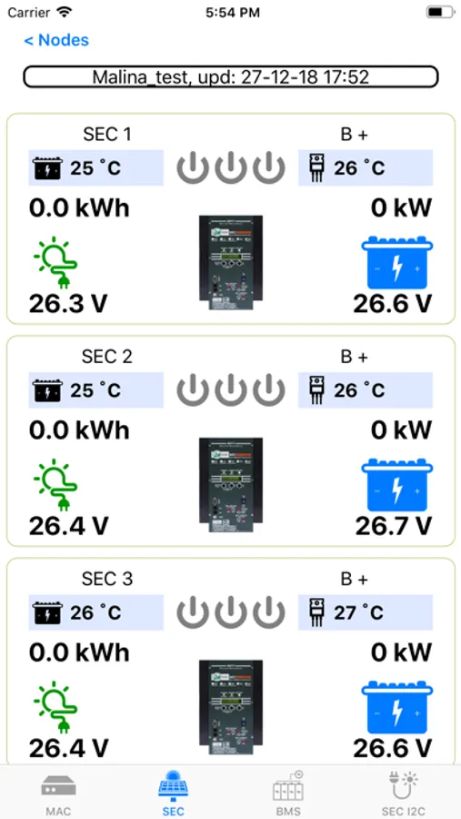 - up to 4 SEC (MPPT controllers): voltages, power, kWh meter, temperatures