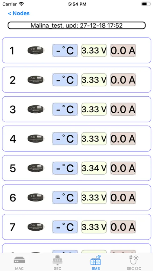 - all BMS, connected to I2C bus with MAC: voltage, temperature
