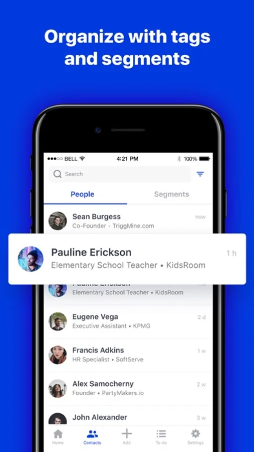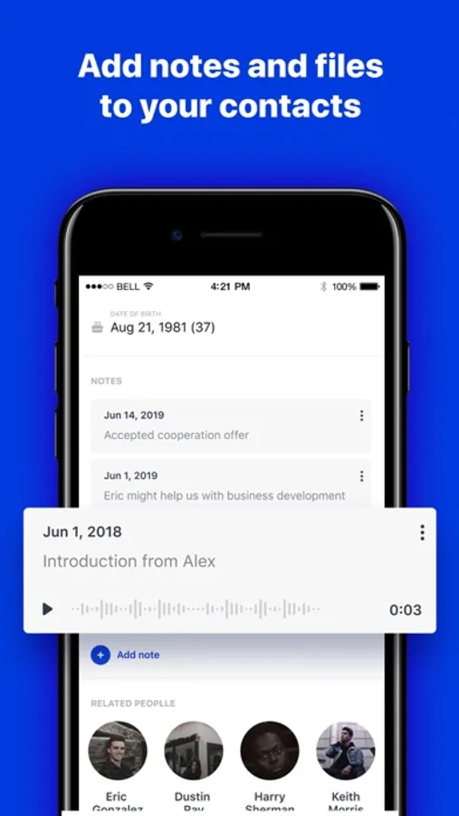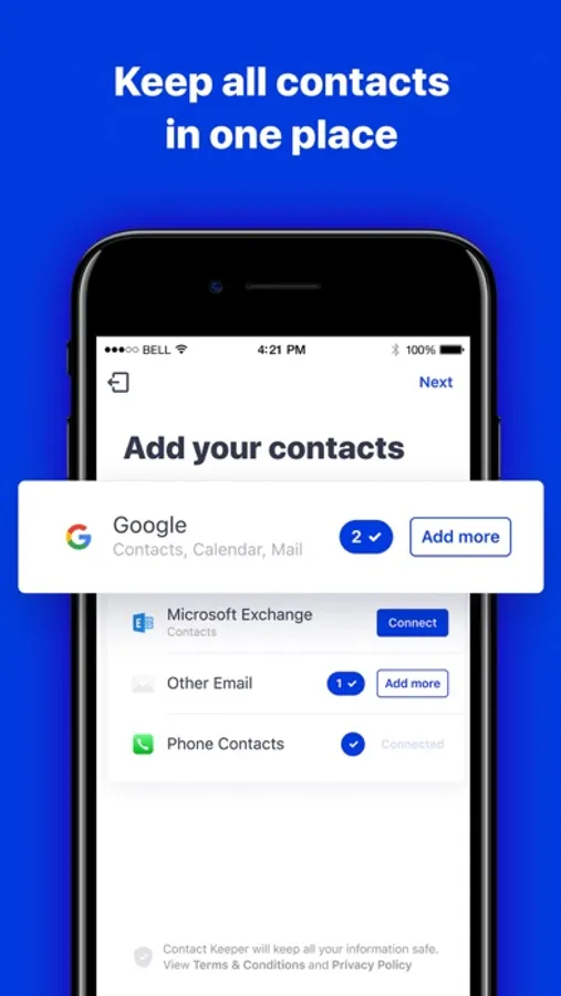 Automatically add contacts from your phone book, Google contacts and email, Outlook, iCloud and messengers.