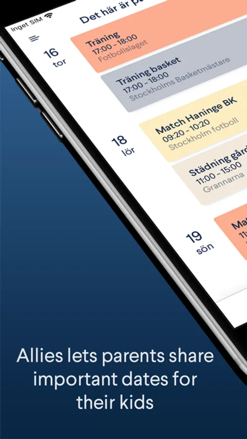 Allies is for parents with children in the same groups; school, sports, after-school activities. In Allies, parents plan everyday life together by sharing information about those groups. In Allies, homework, test dates, game dates, workouts and days off are collected in one place, instead of scattered all over Facebook, WhatsApp, SMS, mail and blogs.
