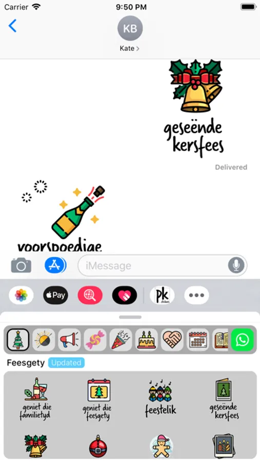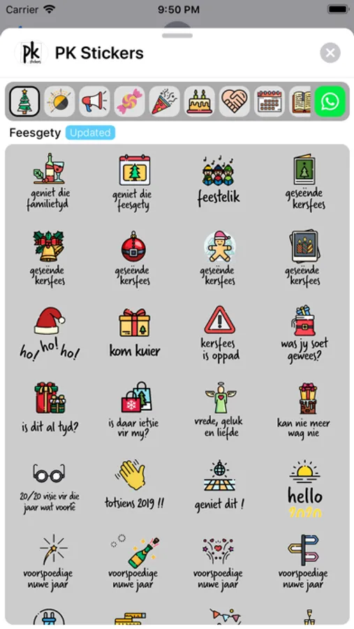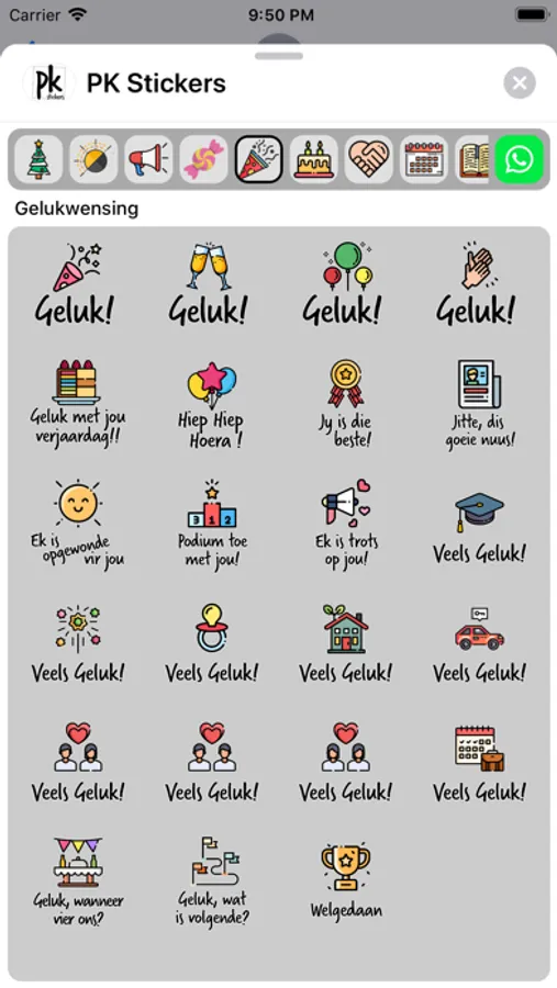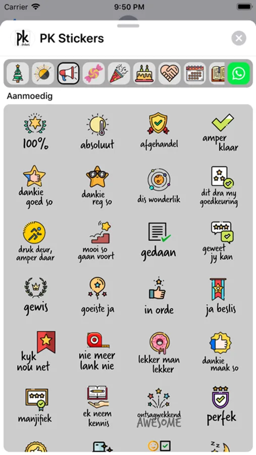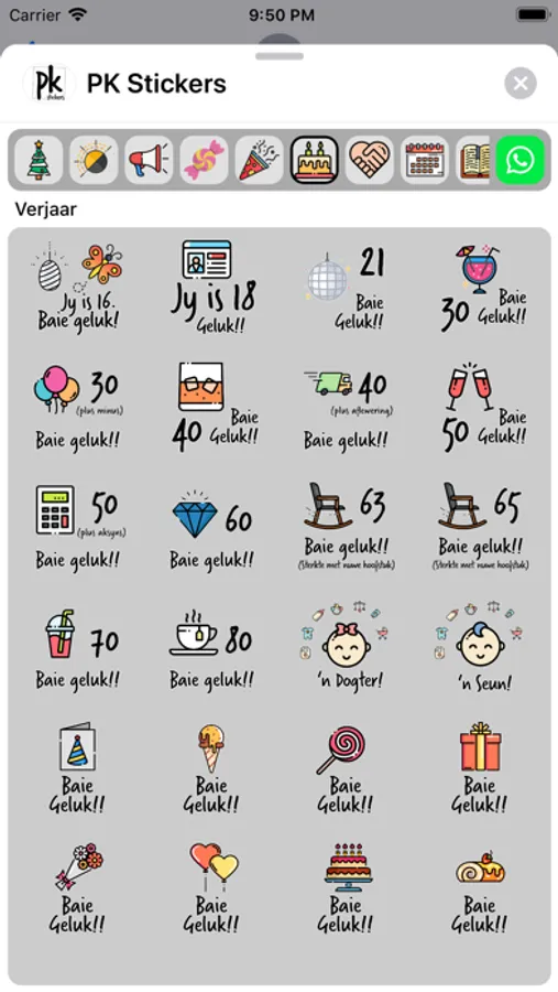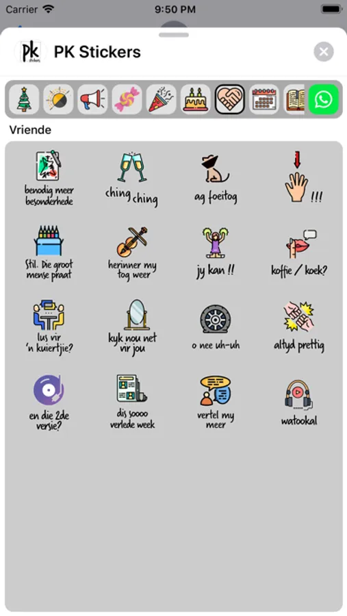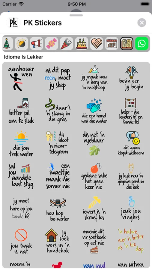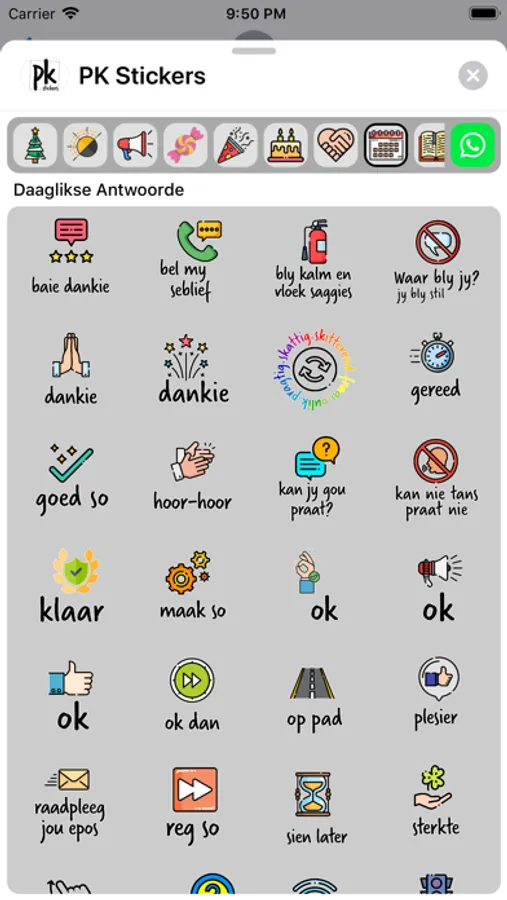 Stickers for birthdays, friends, encouragement, everyday replies, unique Afrikaans expressions, season's greetings, expressions of love and more!