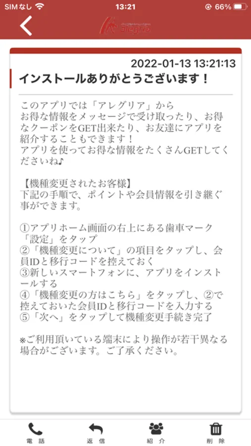 このアプリでは、alegriaの最新情報の受け取りや便利な機能を使う事ができます。