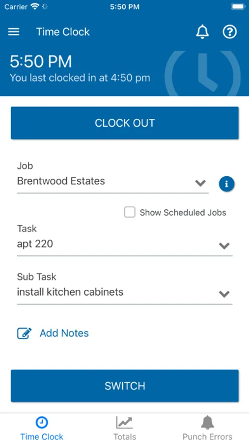Once clocked in, you can change roles and tasks throughout your shift. This lets you create a detailed record of the work you do during your shift. You can quickly see accumulated totals of all your hours worked by day or week. You can also view hours worked on previously logged days.