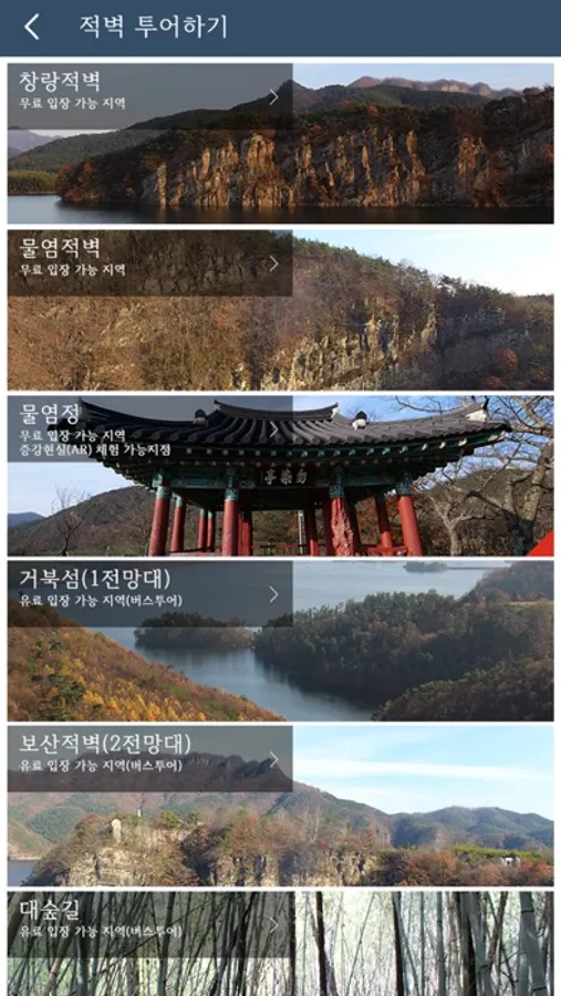 화순적벽 투어를 대표하는 투어지점들에 대한 상세정보와