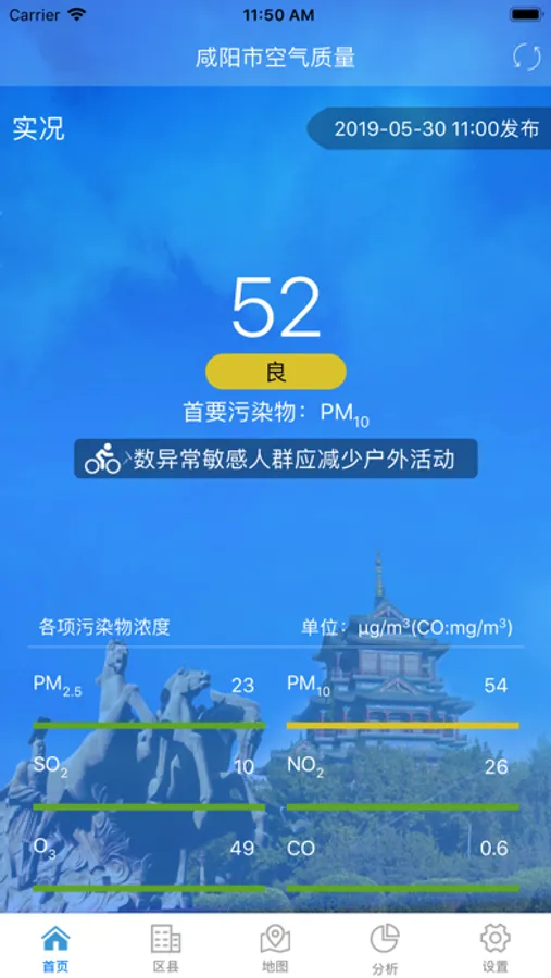 — 分析:可查看空气质量日历、空气质量排名、城市列表、城市对比数据