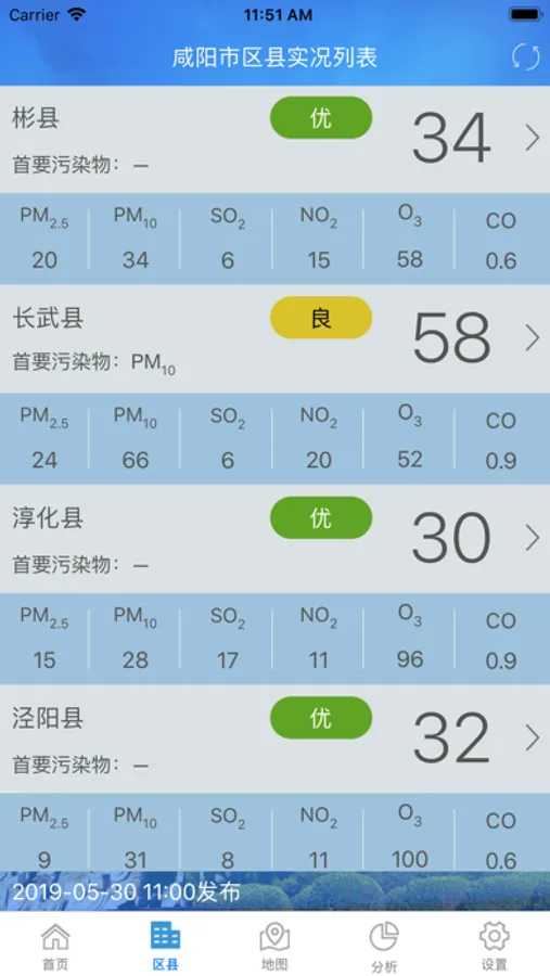 — 区县:可查看咸阳市的区县和区县下所有站点信息