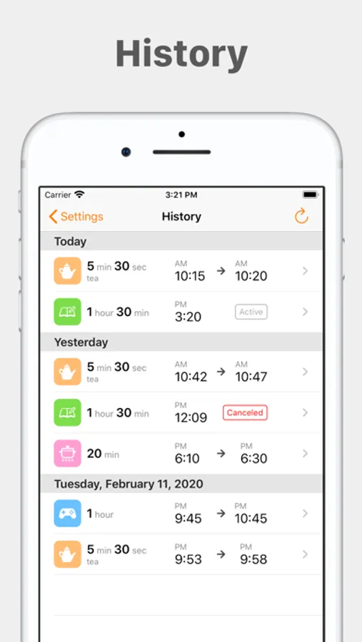 Tap saved timer and the app begin the countdown immediately. When the timer ends, the app notifies you by sound and vibration. If the app is in background, because of the specification of iOS, the app announces you by a notification.