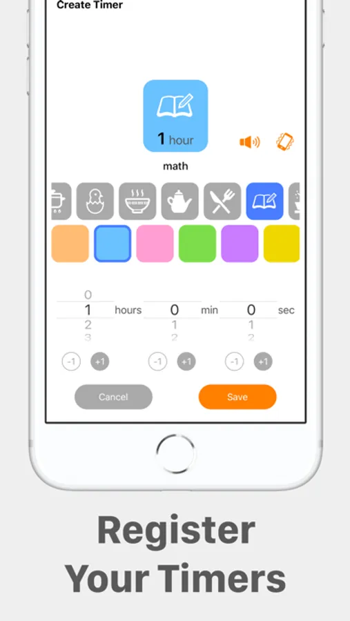 First let's save a timer. Set a time for daily use, such as cooking, studying and game etc. You can select an icon and a color of the timer.