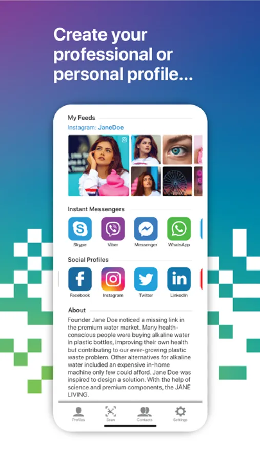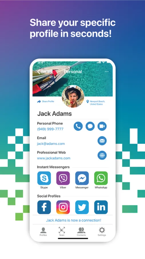 Share or accept ViVr profile by scanning dynamic QR code, Text Message, Email or any messenger app installed on your iPhone