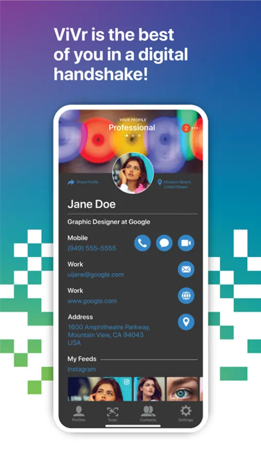 With ViVr, you can create multiple professional or personal profiles tailored to your specific job or hobby and instantly share it with anyone. We recognize life is more than a job and what you do in life is what makes it meaningful and gives it purpose. With ViVr, you align yourself with people that can help you achieve your goals and maximize your own potential in life.