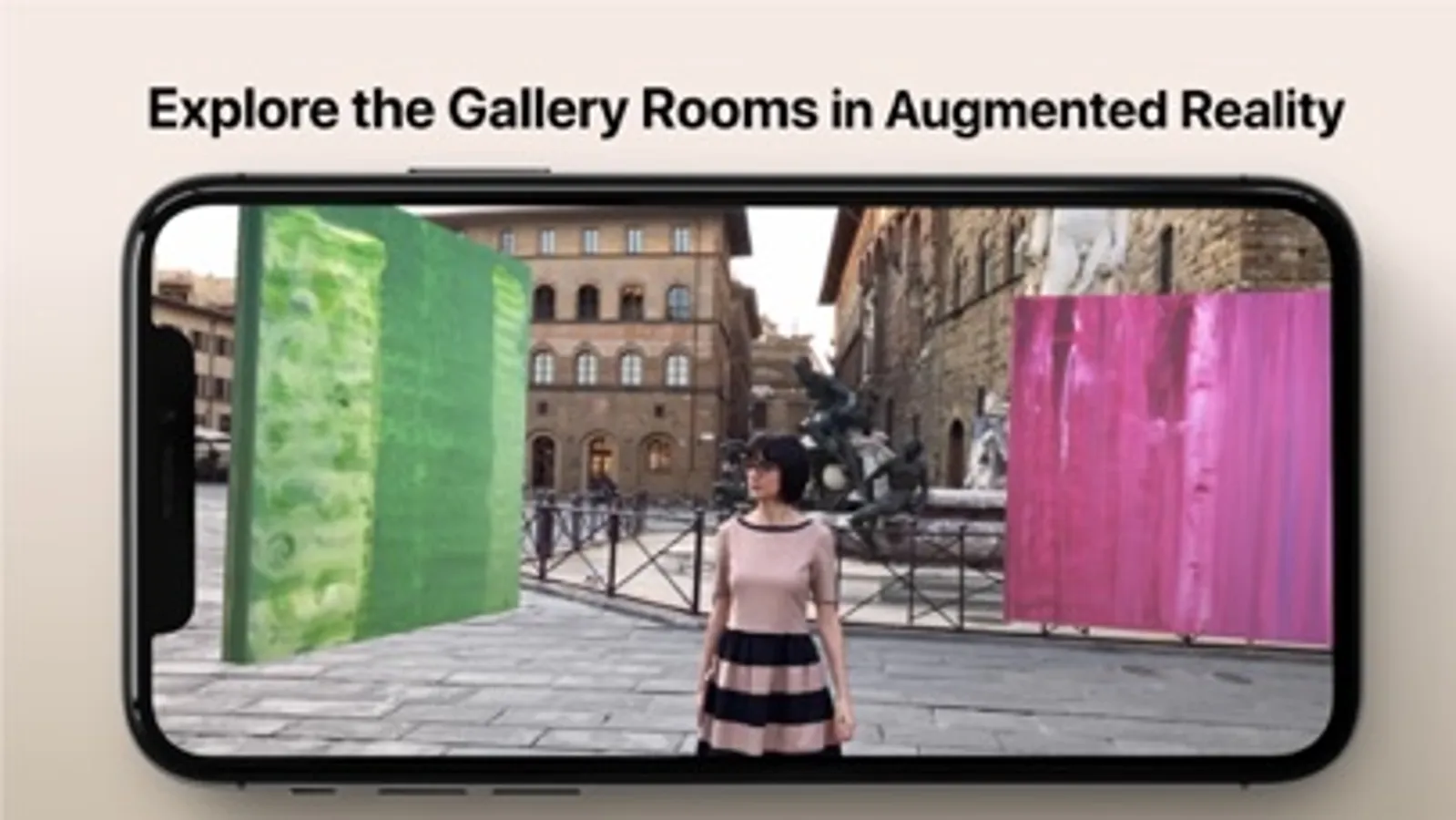 Holding their device in front of them, visitors can physically move around the Pavilions, approach a work to observe its details, move away to get an overview, move to the side to observe it from different perspectives, or move around to observe the artworks exhibited as a whole in the individual rooms.