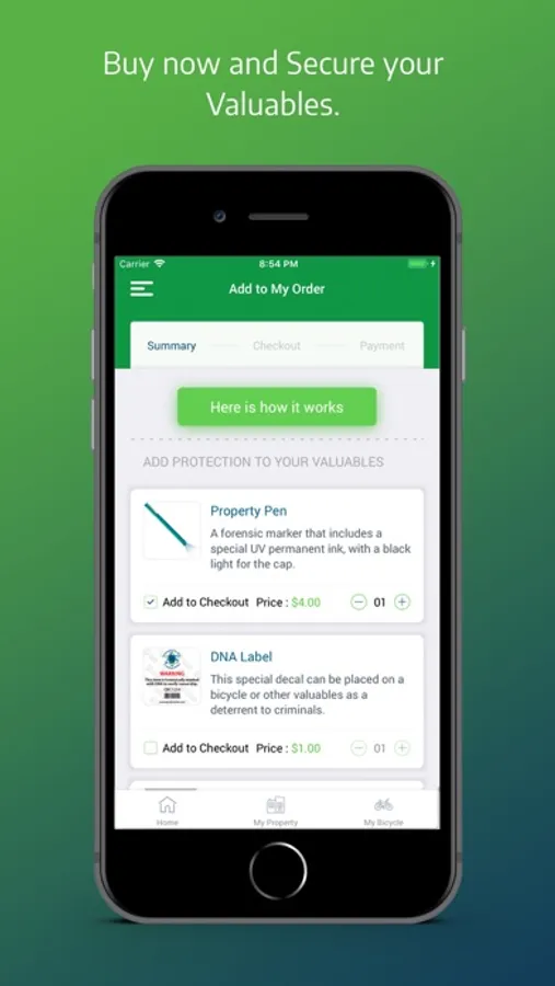 ProtechDNA offers a FREE mobile app to help our users inventory their valuables and store them securely into their account. At the time of registration each user will be assigned a unique PIN (Personal Identification Number) that is recognized by law enforcement around the country. User can apply that PIN to the property with either our DNA adhesive, which is provided FREE at the time of registration (shipping and set up fee required) or a Forensic Property Pen available online for $4.00. Both methods are forensic applications and invisible to the naked eye. All law enforcement has special detection equipment to determine if property has been marked and ability to view the invisible PIN applied to property.